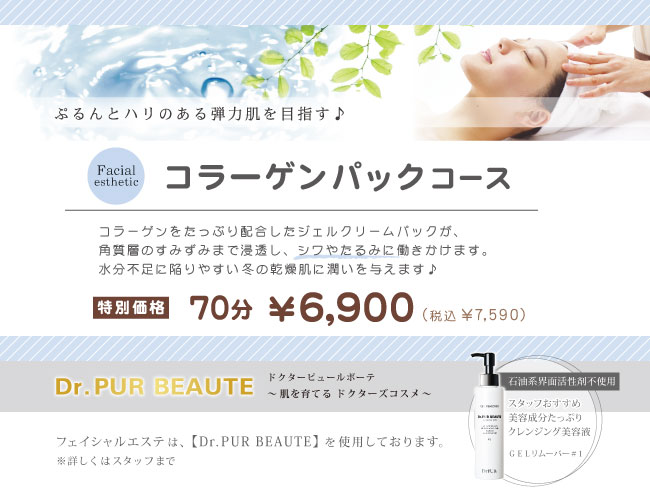 【フェイシャル】コラーゲンパックコース 特別価格>>70分 6,900円(税込7,590円)