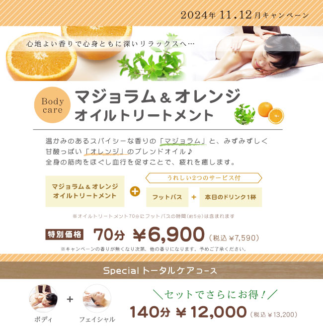 【ボディケア】マジョラム&オレンジオイルトリートメント 特別価格>>70分 6,900円(税込7,590円)